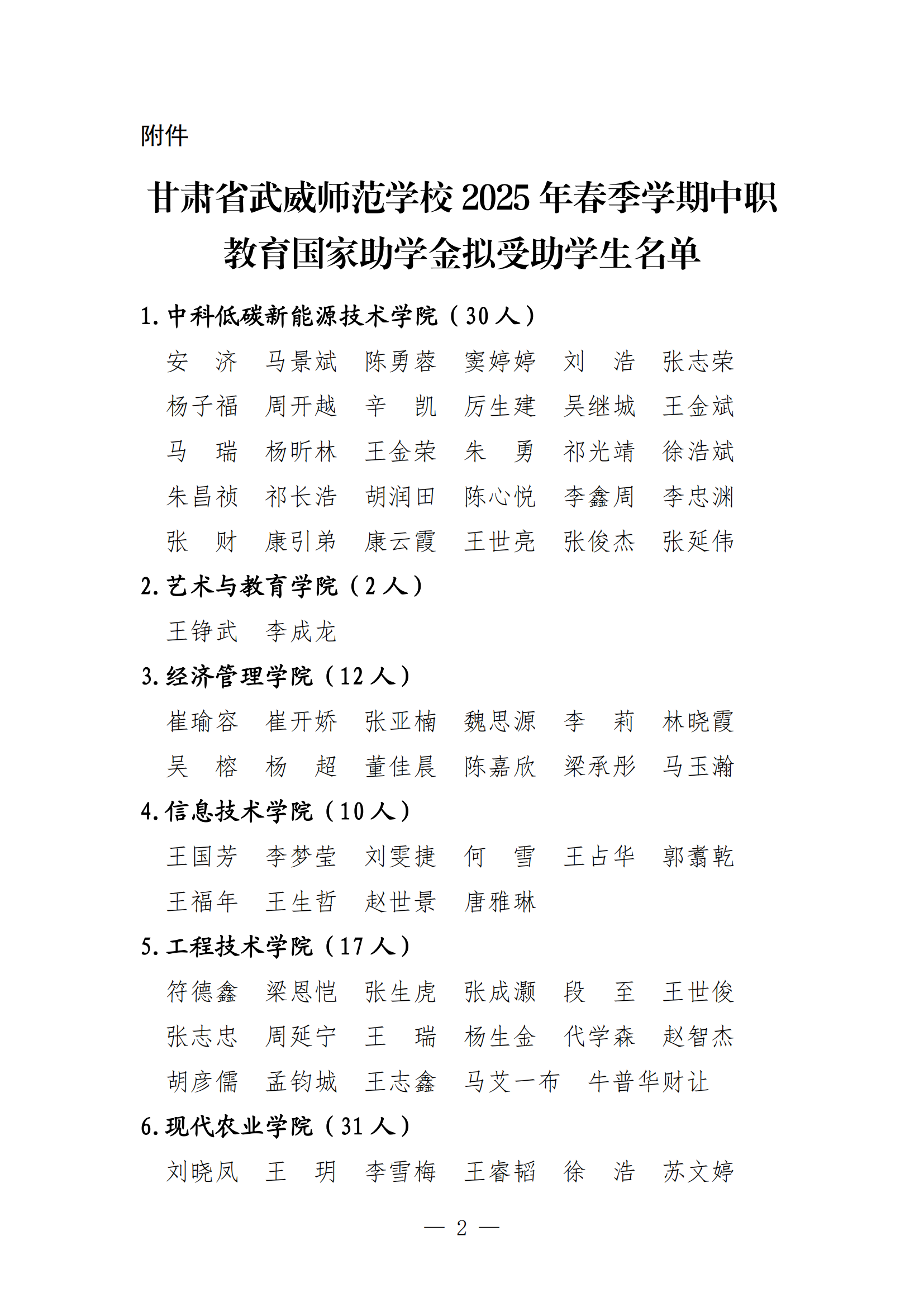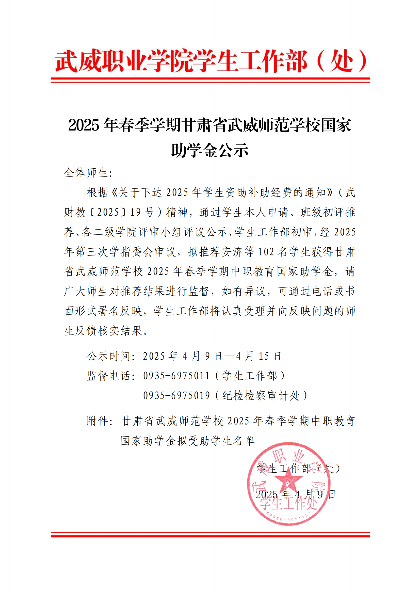 2025年春季學(xué)期甘肅省武威師范學(xué)校國家助學(xué)金公示