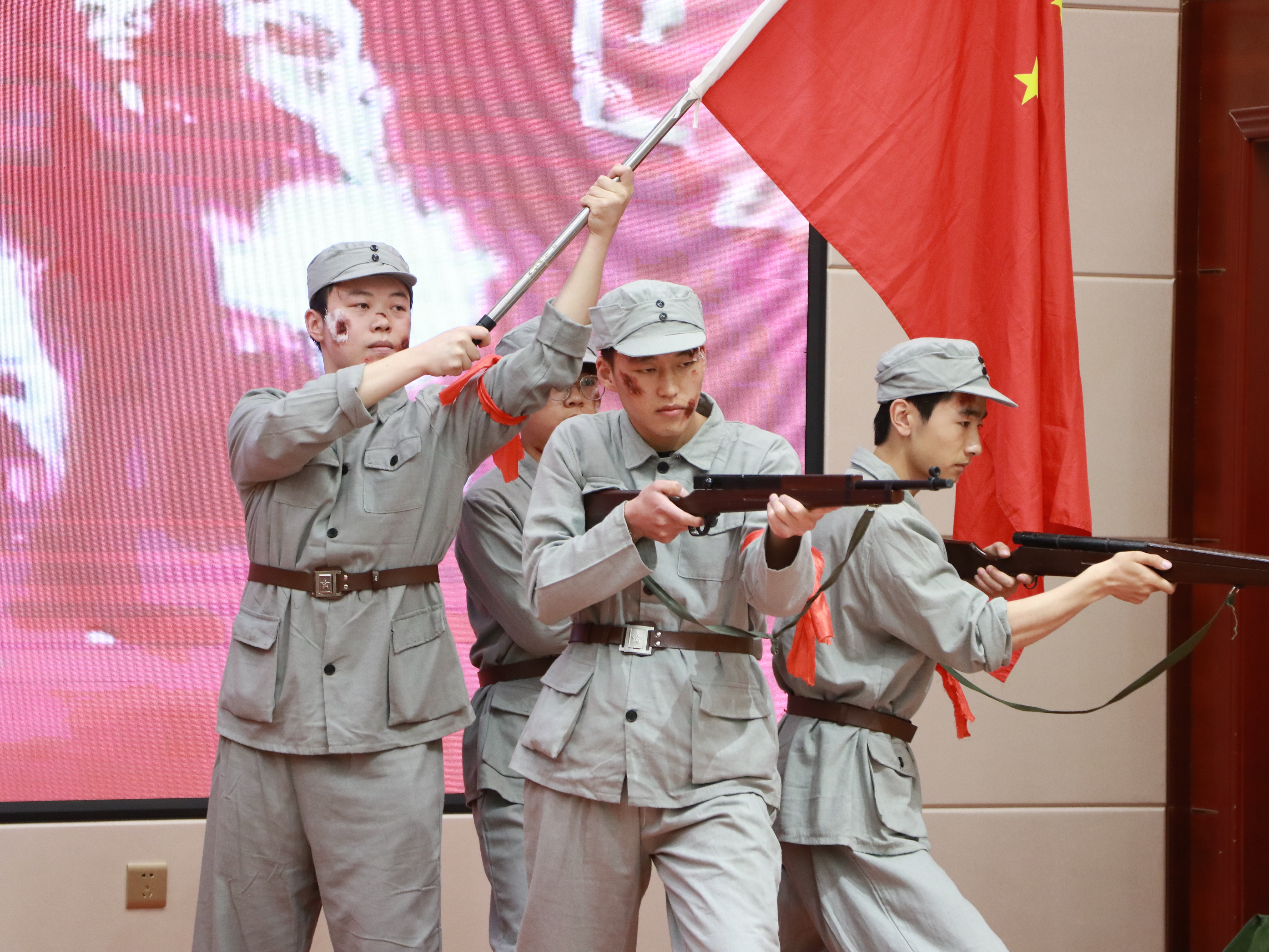 比賽現(xiàn)場,各參賽隊伍以“誦、演、歌、頌”的復(fù)合表達,帶領(lǐng)觀眾穿越歷史烽煙,重現(xiàn)那段氣壯山河的抗戰(zhàn)歲月。他們或慷慨激昂地講述革命先輩寧死不屈的壯舉,或手持泛黃家書深情誦讀,絕筆信中的母愛與家國大義在顫抖的聲線中重現(xiàn);或化身硝煙中的戰(zhàn)士,用染血繃帶與折斷鋼槍演繹出“十萬青年十萬軍”的悲壯群像。那些被歲月蝕刻的墨跡,此刻正在當(dāng)代青年的瞳孔里重新燃燒。一句句飽含深情的誦讀,一幕幕震撼人心的演繹,都傳遞著同學(xué)們對抗戰(zhàn)英烈的深切緬懷與崇高敬意?,F(xiàn)場掌聲如潮水般此起彼伏,經(jīng)久不息,激蕩著每一位觀眾的愛國情懷。