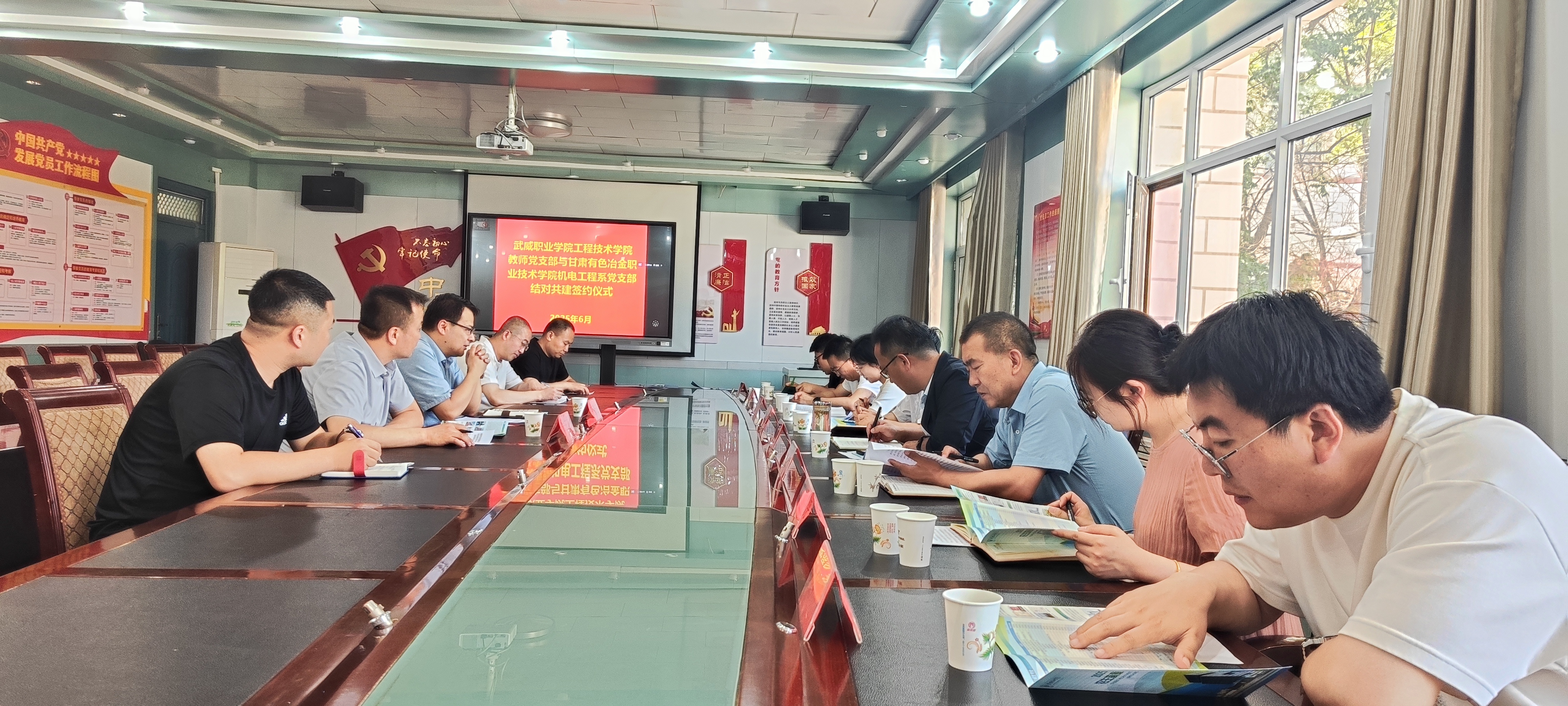 為進(jìn)一步加強(qiáng)黨組織建設(shè),提升黨員的政治素養(yǎng)和黨性修養(yǎng),6月11日,學(xué)校工程技術(shù)學(xué)院教師黨支部和甘肅有色冶金職業(yè)技術(shù)學(xué)院機(jī)電工程系黨支部結(jié)對(duì)共建簽約儀式在博學(xué)樓黨員活動(dòng)室舉行。甘肅有色冶金職業(yè)技術(shù)學(xué)院組織部部長(zhǎng)高立兵、督導(dǎo)中心主任趙登峰、機(jī)電工程系黨支部書記侯婷婷,學(xué)校工程技術(shù)學(xué)院黨總支書記王鐸云、副院長(zhǎng)徐生龍出席儀式,雙方黨員共計(jì)20人參加儀式。