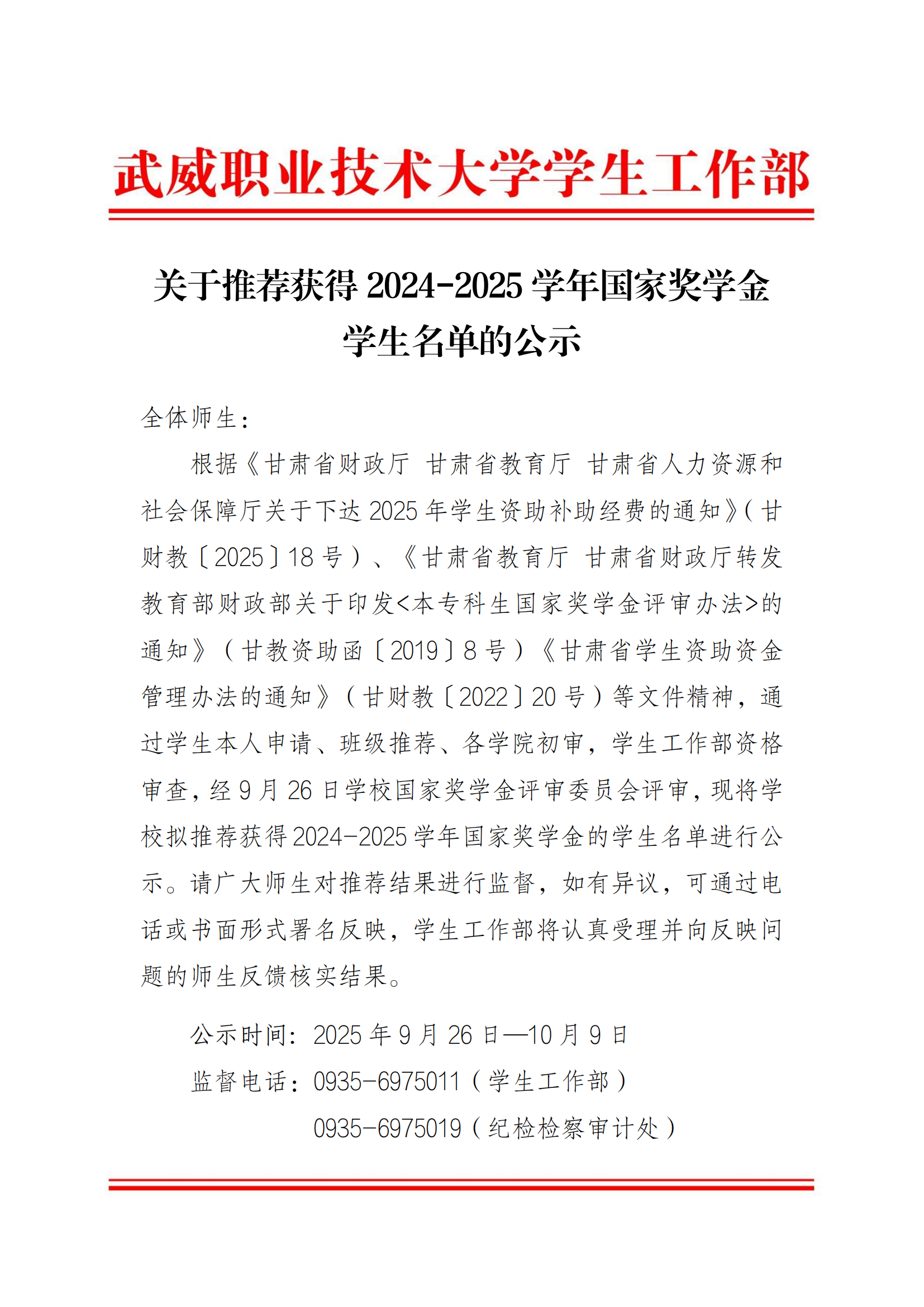 關(guān)于推薦獲得2024-2025學(xué)年國家獎(jiǎng)學(xué)金學(xué)生名單的公示