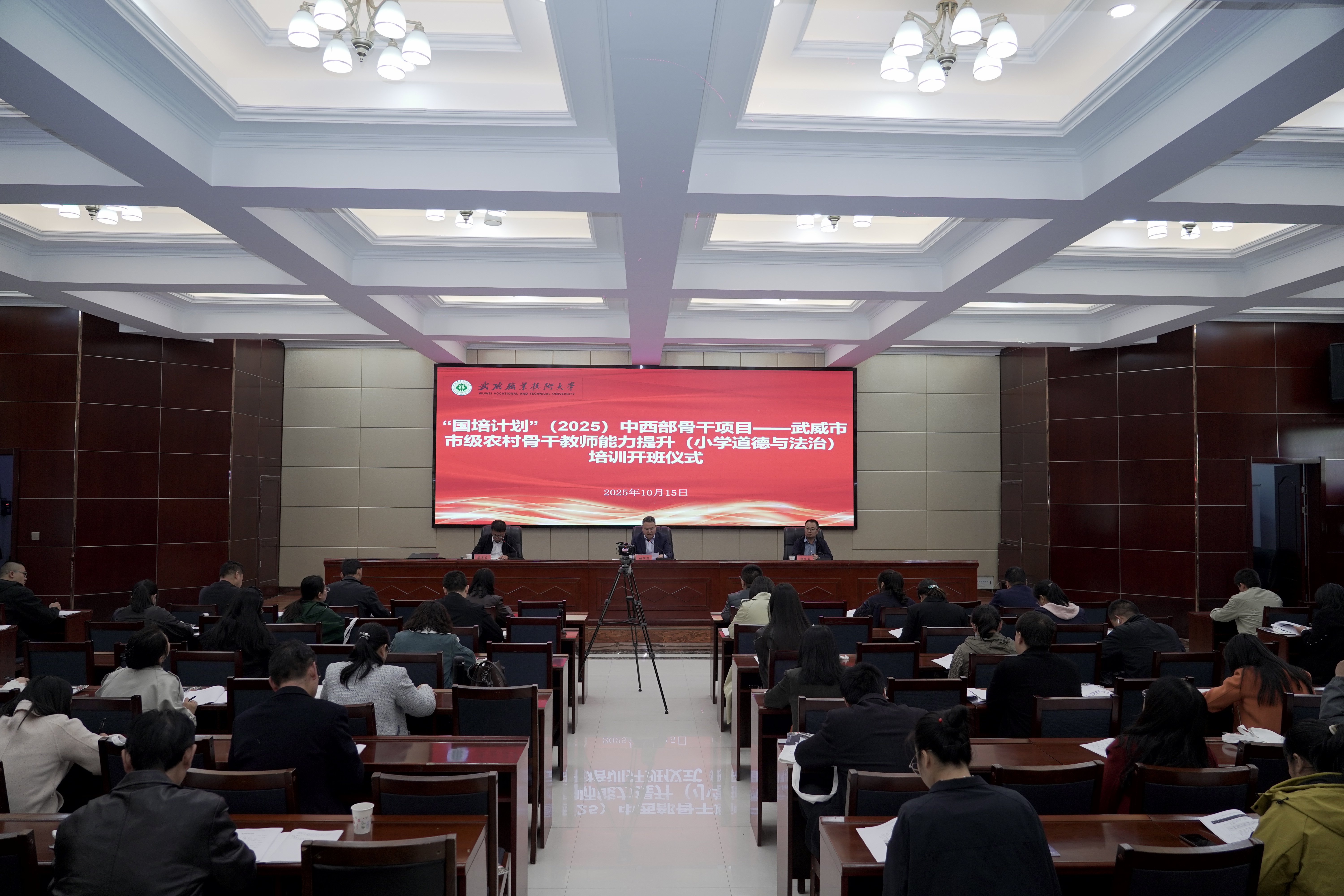 10月15日,由武威市教育局主辦、武威職業(yè)技術(shù)大學(xué)承辦的“國培計劃”(2025)中西部骨干項目——武威市市級農(nóng)村骨干教師能力提升(小學(xué)道德與法治)培訓(xùn)班在學(xué)校行樹樓北側(cè)報告廳正式開班。學(xué)校黨委委員、副校長伍國強出席開班儀式。培訓(xùn)組織管理工作人員及60名參訓(xùn)骨干教師共同參加。開班儀式由學(xué)校國際合作交流處副處長蔡濟眾主持。