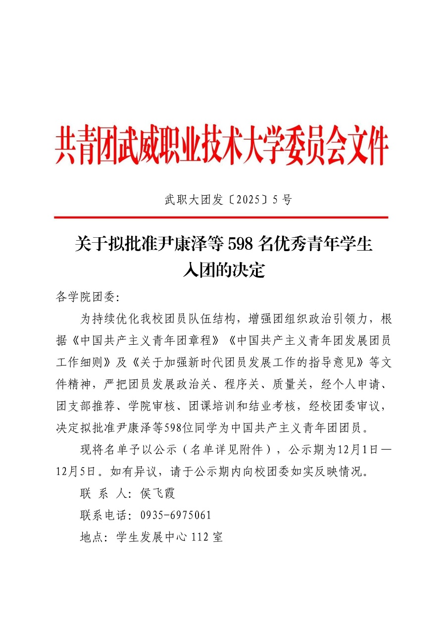 關于擬批準尹康澤等598名優(yōu)秀青年學生入團的決定