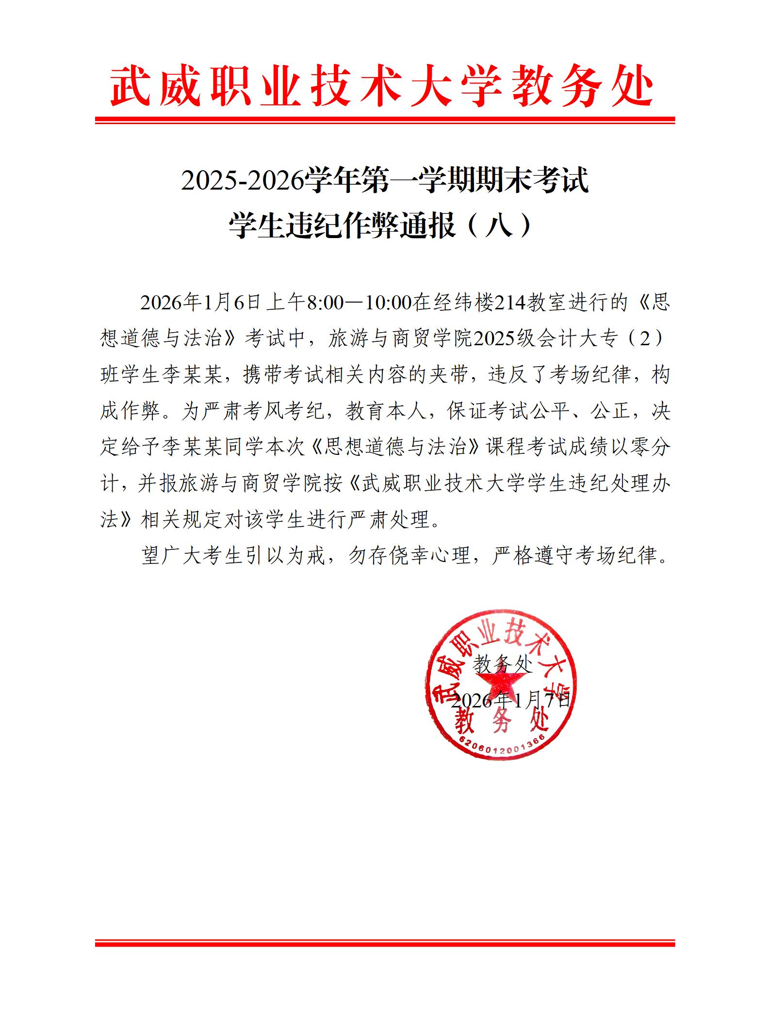 2025-2026學(xué)年第一學(xué)期期末考試學(xué)生違紀作弊通報(七)