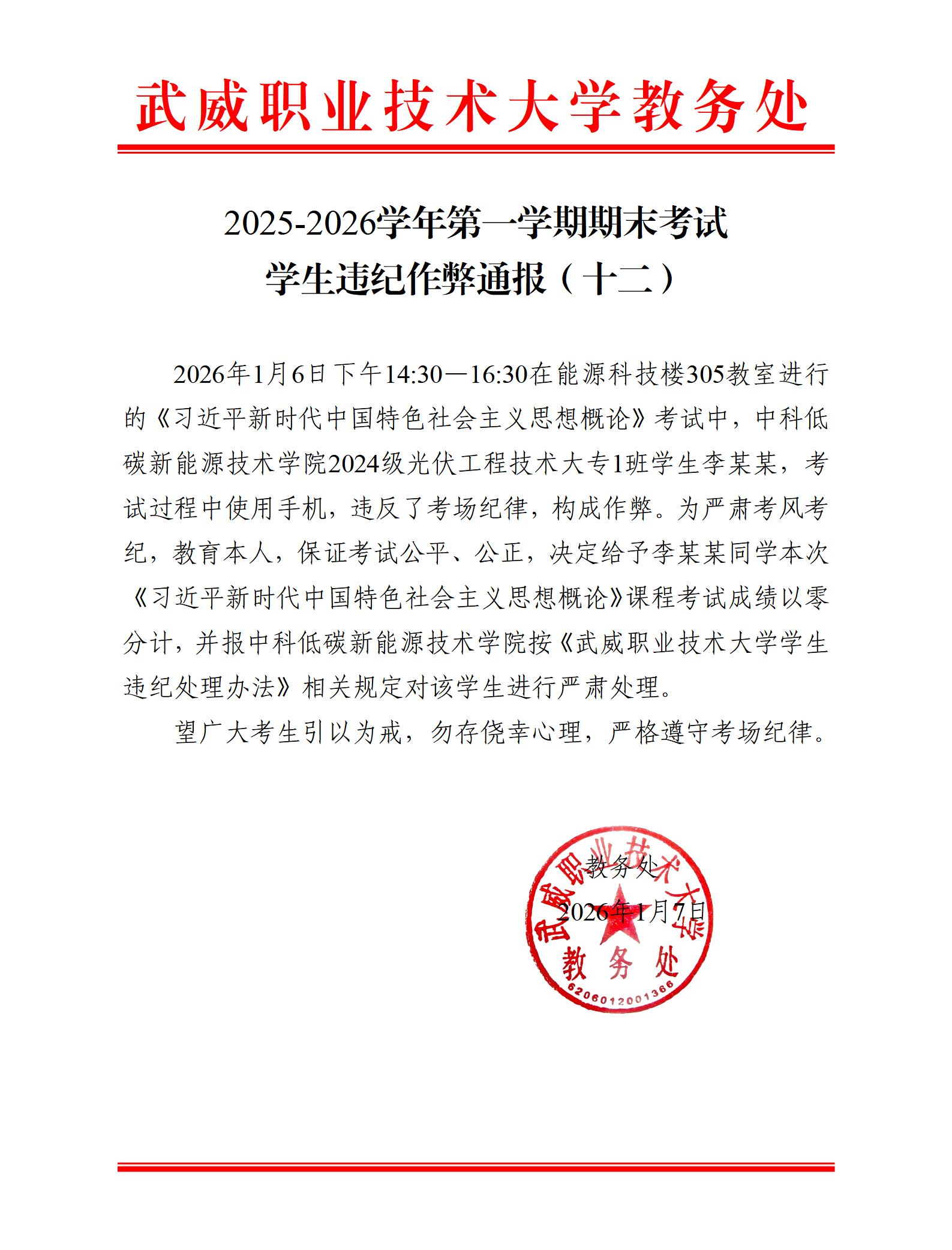 2025-2026學(xué)年第一學(xué)期期末考試學(xué)生違紀(jì)作弊通報(十二)
