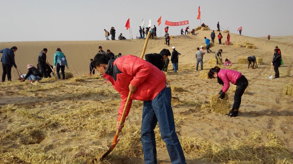 早上9點,志愿者們在武威市青年志愿者協(xié)會的帶領下參觀了民勤防沙治沙展覽館,了解了勤勞的民勤人民在防沙治沙的歷程中付出的艱辛和取得的成果。隨后,志愿者們到達了民勤縣薛百鄉(xiāng)黃篙井的壓沙現(xiàn)場,按照劃分好的區(qū)域,在專業(yè)技術人員指導下,志愿者們鋪草壓沙,勞動場面分工明確,井然有序。經過一天的辛勤勞動,50余畝沙丘變成了棋格般整齊的沙障,堅實的沙障阻止了沙丘的移動,為明春造林活動打好了基礎。