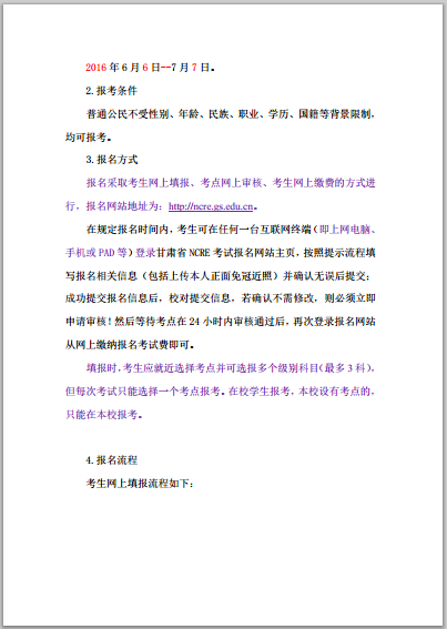 根據(jù)甘肅省教育考試院《關(guān)于做好2016年9月全國(guó)計(jì)算機(jī)等級(jí)考試網(wǎng)上報(bào)名工作的通知》(甘教考院〔2016〕95號(hào)文件)要求,2016年9月全國(guó)計(jì)算機(jī)等級(jí)考試(NCRE)將于2016年6月6日開始報(bào)名,全省統(tǒng)一實(shí)行網(wǎng)上報(bào)名。本次報(bào)名按照考生網(wǎng)上填報(bào)、考點(diǎn)網(wǎng)上審核、考生網(wǎng)上繳費(fèi)的步驟進(jìn)行?,F(xiàn)將有關(guān)安排及要求通知如下: