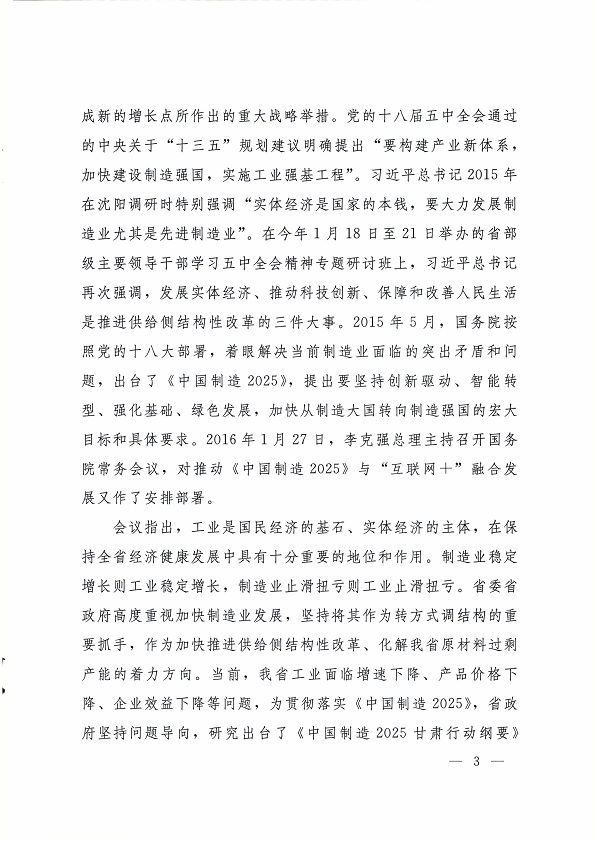 2016 年 1 月 30 日,省委副書記、省長(zhǎng)、中國(guó)制造 2025甘肅行動(dòng)綱要協(xié)調(diào)推進(jìn)領(lǐng)導(dǎo)小組組長(zhǎng)劉偉平主持召開了協(xié)調(diào)推進(jìn)領(lǐng)導(dǎo)小組第一次會(huì)議,研究部署我省行動(dòng)綱要的協(xié)調(diào)和推進(jìn)工作?,F(xiàn)將《中國(guó)制造 2025 甘肅行動(dòng)綱要協(xié)調(diào)推進(jìn)領(lǐng)導(dǎo)小組第一次會(huì)議紀(jì)要》轉(zhuǎn)發(fā)你們。
