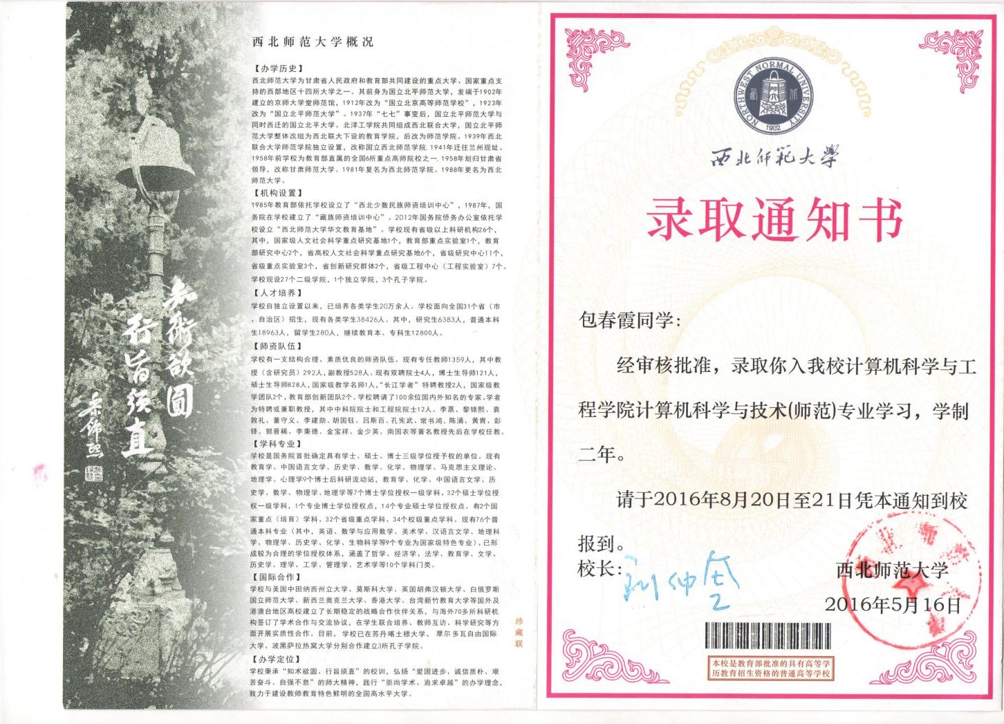 近日傳來(lái)喜訊,我系13級(jí)計(jì)算機(jī)應(yīng)用大專(zhuān)班包春霞同學(xué)在2016年甘肅省專(zhuān)升本考試中,被西北師范大學(xué)計(jì)算機(jī)科學(xué)與工程學(xué)院錄取。