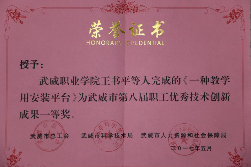 為貫徹落實武威市委、市政府關(guān)于《武威市十萬職工職業(yè)技能素質(zhì)提升活動工作方案(2016-2020年)》(武政辦發(fā)〔2016〕72號)文件精神,推動我市“雙創(chuàng)”工作的深入開展,激發(fā)我市廣大企事業(yè)職工提升技能和開拓創(chuàng)新的熱情。近日,由市總工會、市人社局、市科技局等單位聯(lián)合舉辦了“武威市第八屆職工技術(shù)創(chuàng)新成果評選活動”。本屆職工技術(shù)創(chuàng)新成果評選共征集創(chuàng)新成果87項,其中:學(xué)院推薦了十項研究課題、專利技術(shù)項目,王書平團(tuán)隊《一種教學(xué)用安裝平臺》項目成果榮獲一等獎,申賓德團(tuán)隊《簡易焊工考試用帶坡口鋼板火焰切割下料機(jī)的研究與應(yīng)用》,王勝團(tuán)隊《“胰美舒”治療2型糖尿病周圍神經(jīng)病變(氣陰兩虛兼瘀證)的臨床觀察》項目成果榮獲三等獎。