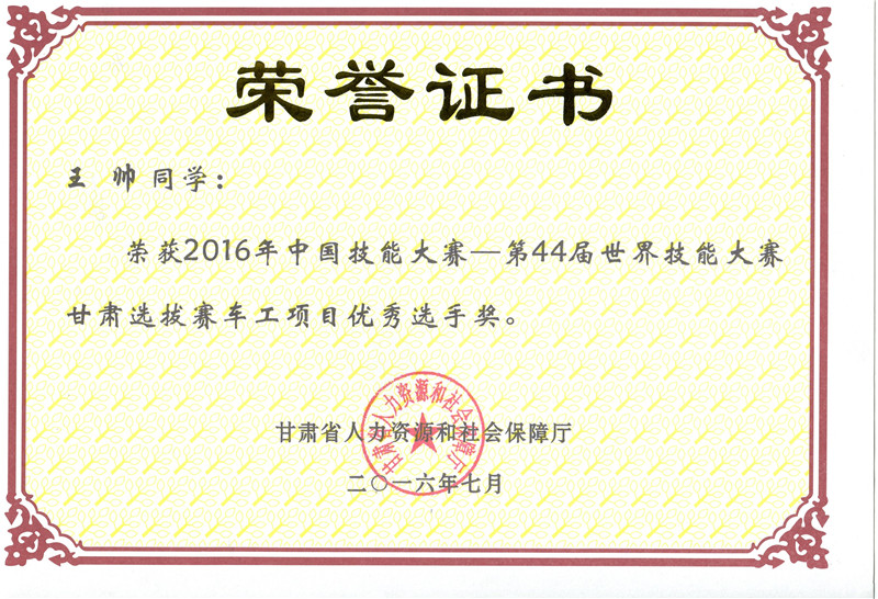 - 上一篇:第44屆世界技能大賽甘肅選拔賽裝配鉗工項(xiàng)目?jī)?yōu)秀獎(jiǎng)[ 06-21 ]