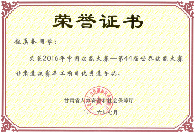 第44屆世界技能大賽甘肅選拔賽車(chē)工項(xiàng)目?jī)?yōu)秀獎(jiǎng)
