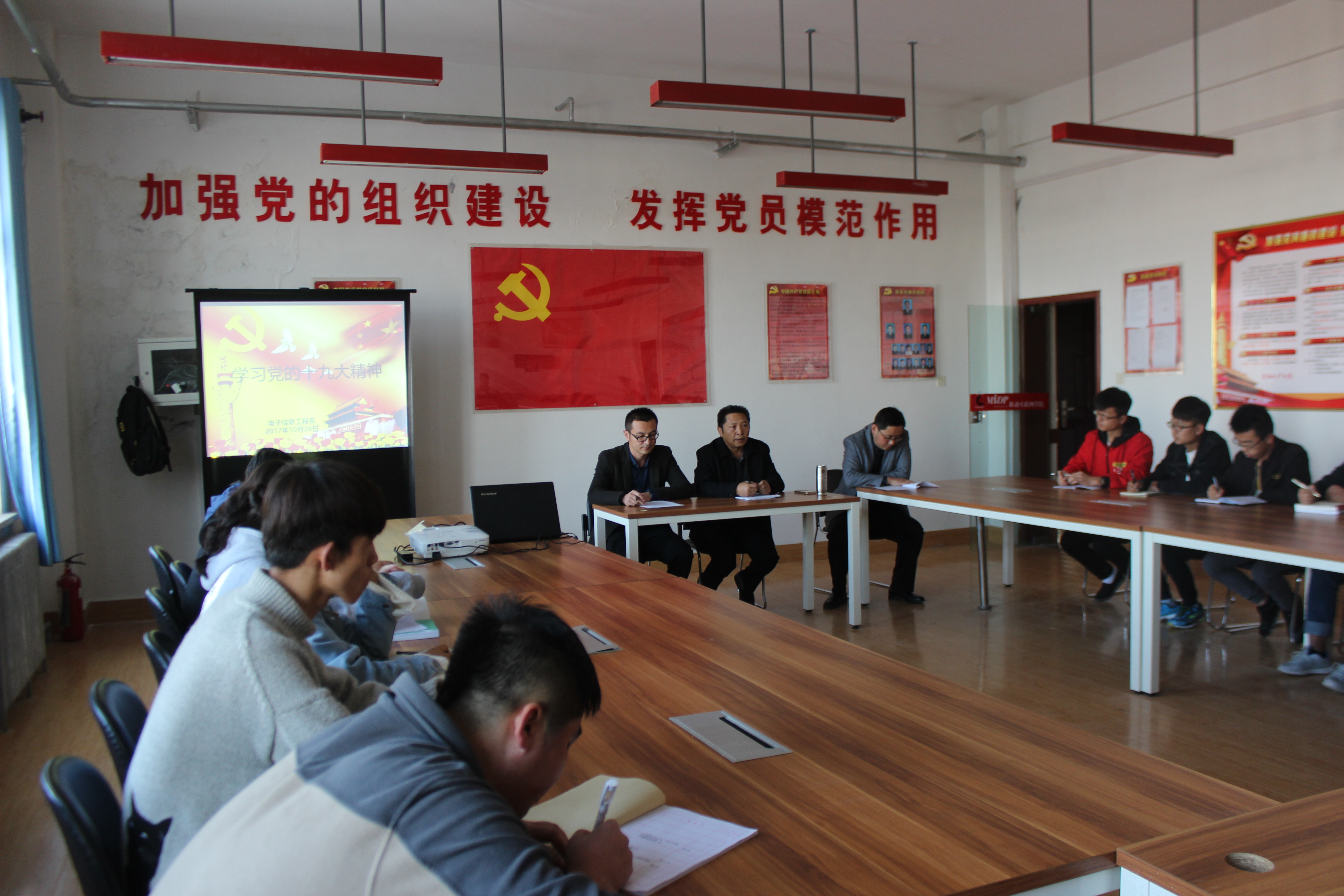 10月26日,電子信息工程系組織全體教師、學(xué)生干部在尚德樓黨員活動(dòng)室集中學(xué)習(xí)黨的十九大報(bào)告和十九大會(huì)議精神。系黨總支書記袁青年主持學(xué)習(xí)會(huì)議。