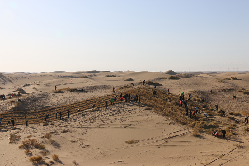 在勞動現(xiàn)場,學院領導和師生們不畏冬寒,分工協(xié)作,按照標準和要求劃線開溝、蒲草培沙、等距離推進,現(xiàn)場一片熱火朝天的景象。荒蕪的沙地身披新衣,整齊的稻草方格逐漸向遠處的沙丘覆蓋。